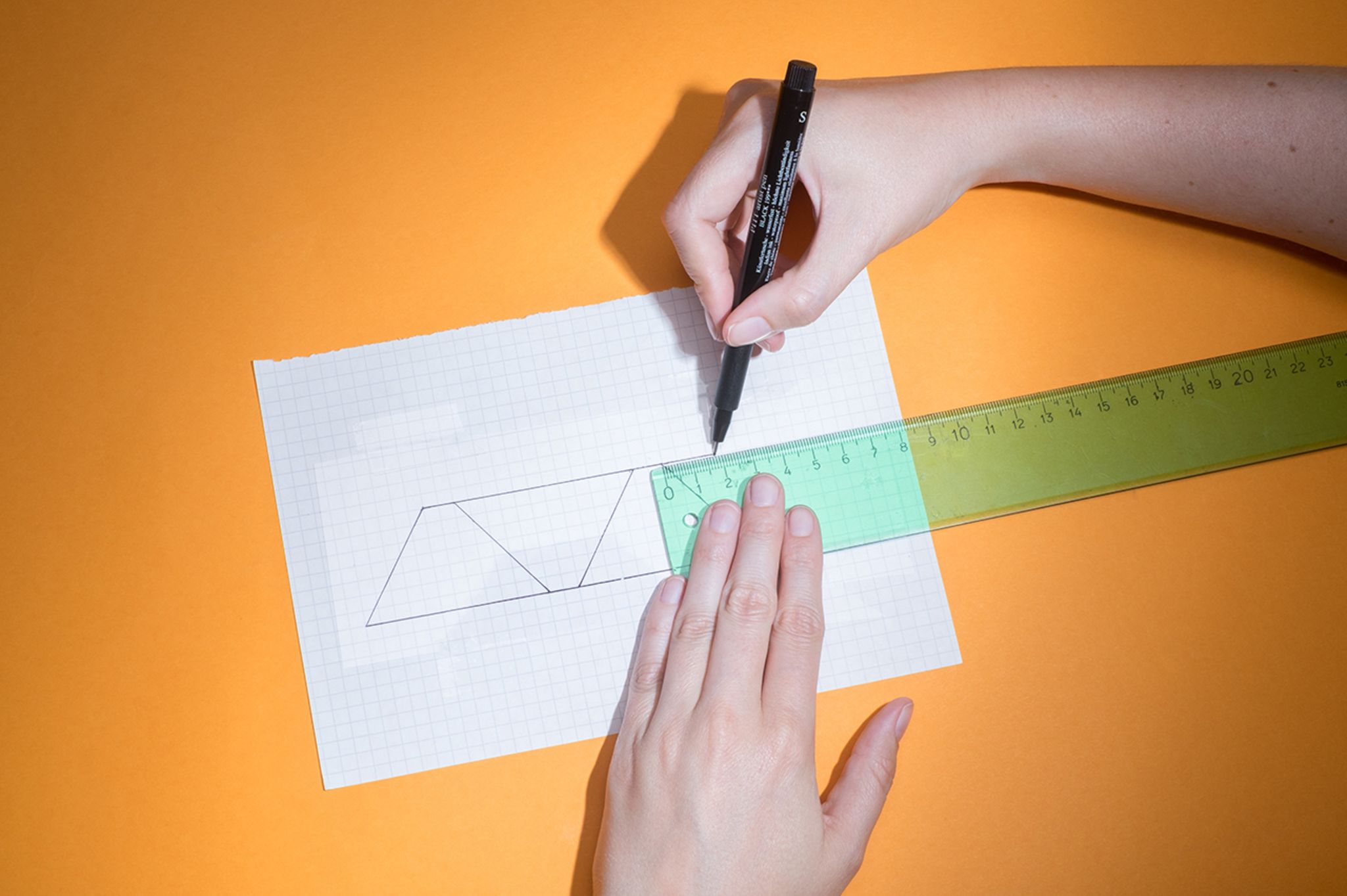 1: Klebt mit Klebefilm die Plastikfolie auf das karierte Papier. Zeichnet ein Trapez mit den Maßen aus der Skizze unten auf die Folie.