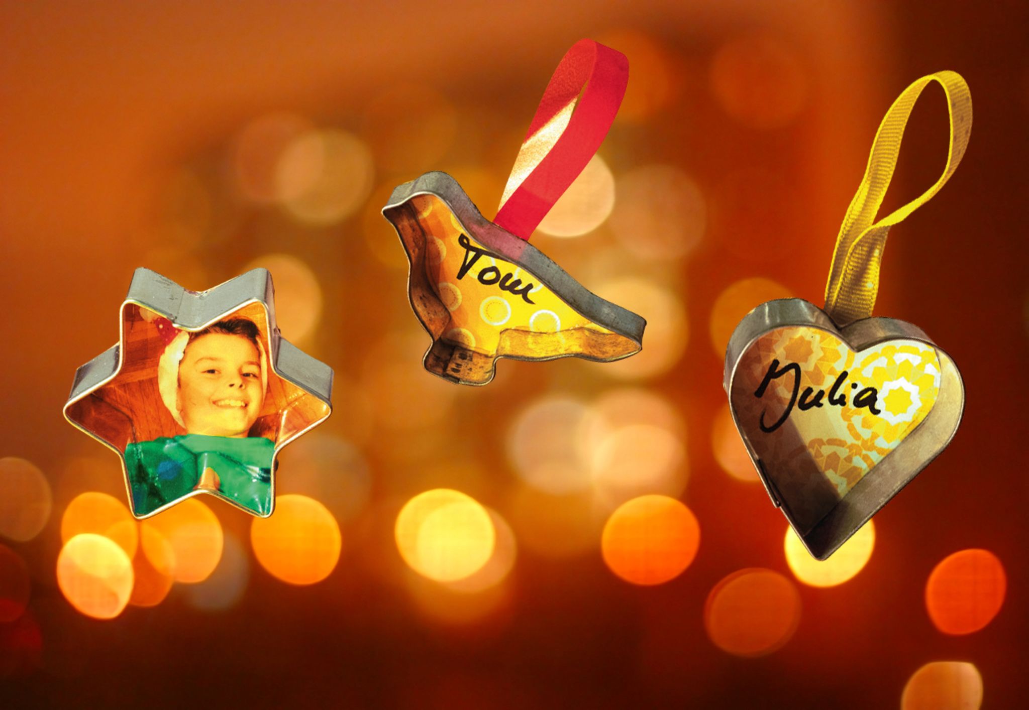 - Drückt das Ganze leicht an und lasst es trocknen. Schneidet alles, was übersteht, entlang der Kante des Ausstechers ab. Oder aber ihr notiert die Namen auf buntem Papier. Verfahrt dann genauso wie mit den Fotos.