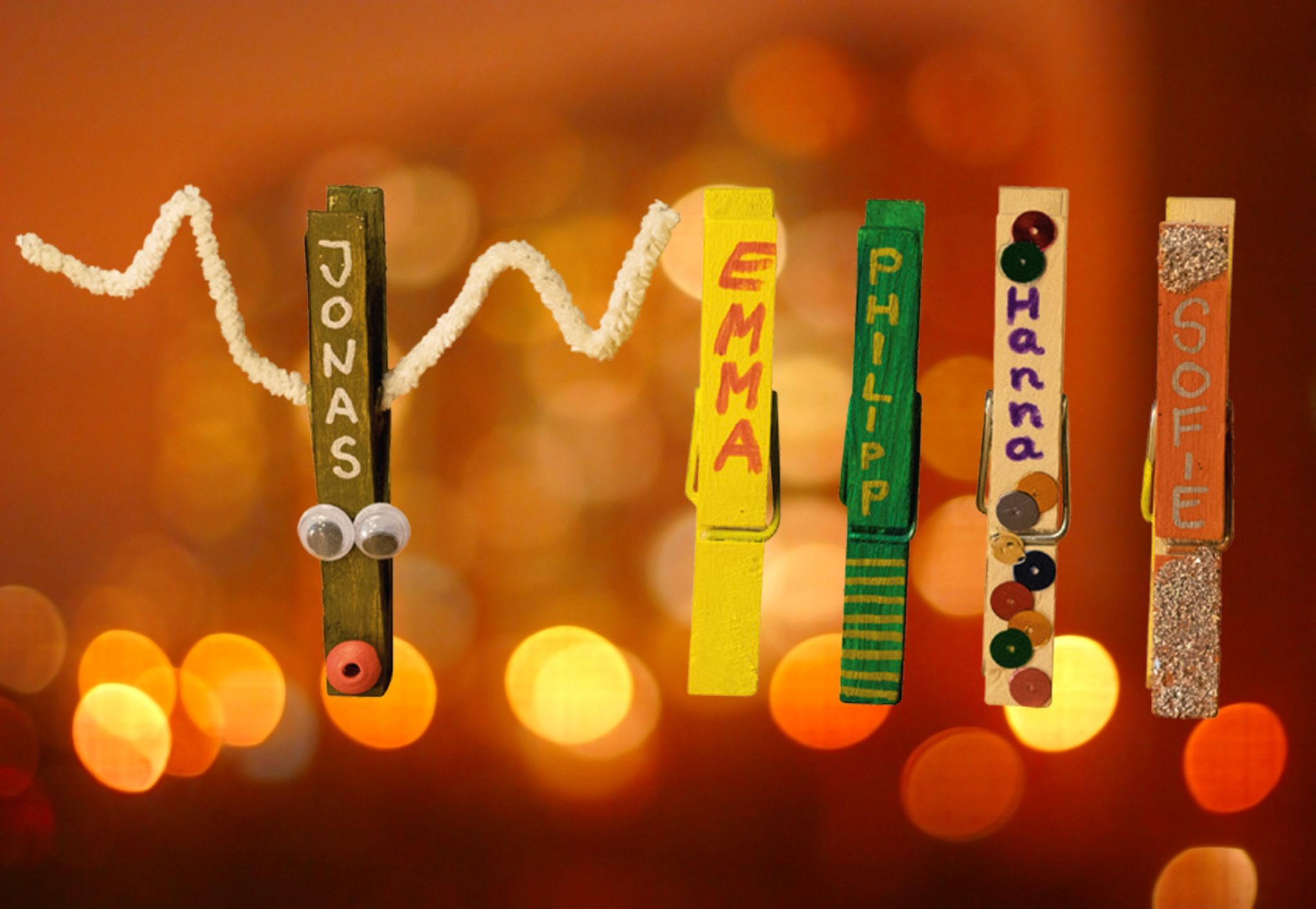 - Variante 3 : Beklebt die Wäscheklammer mit Glitzerpulver und Pailletten; spart nur etwas Platz für den Namen aus.