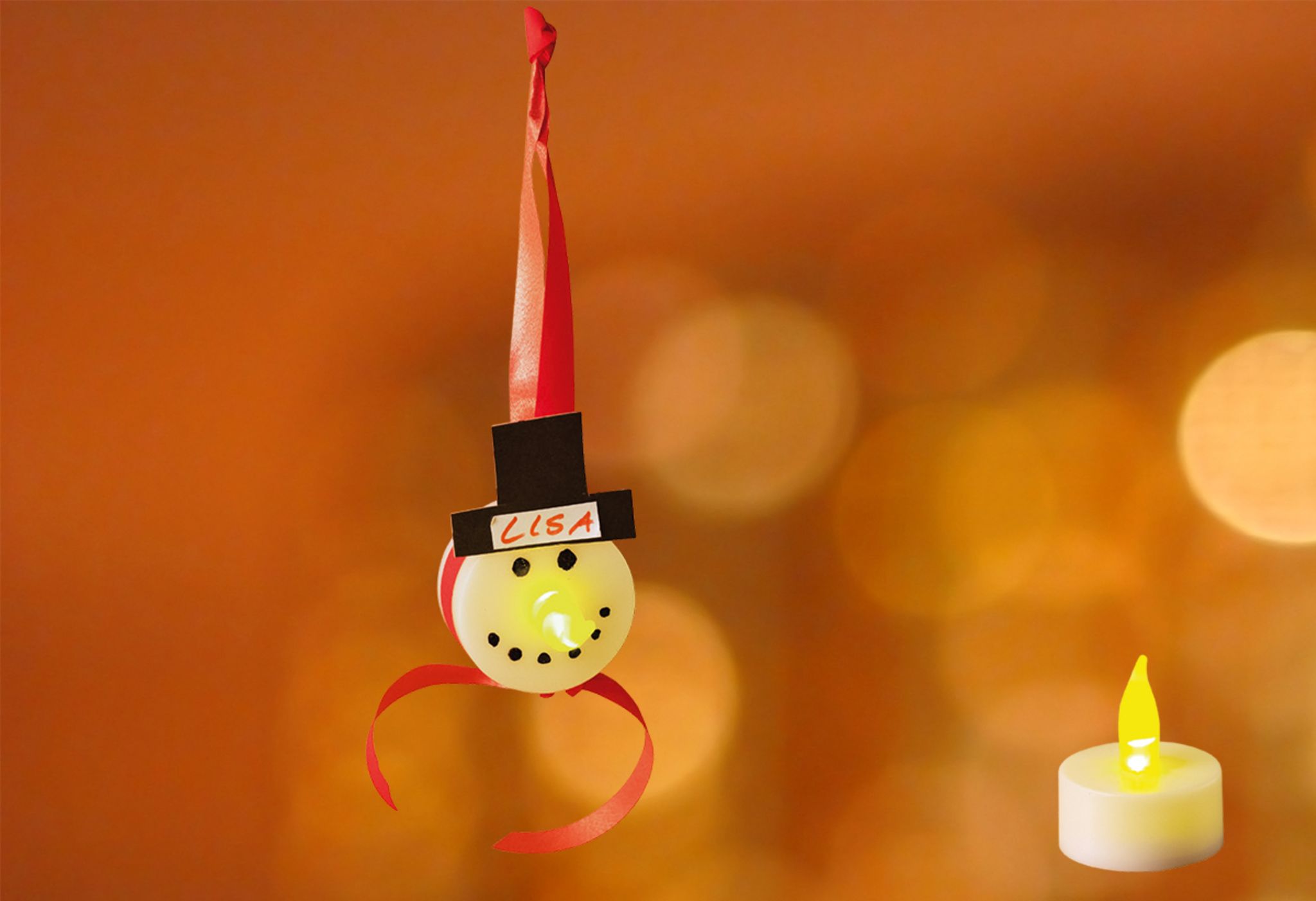 - Schnappt euch das LED-Licht und tupft mit dem schwarzen Stift Schneemannaugen und einen Schneemannmund auf.