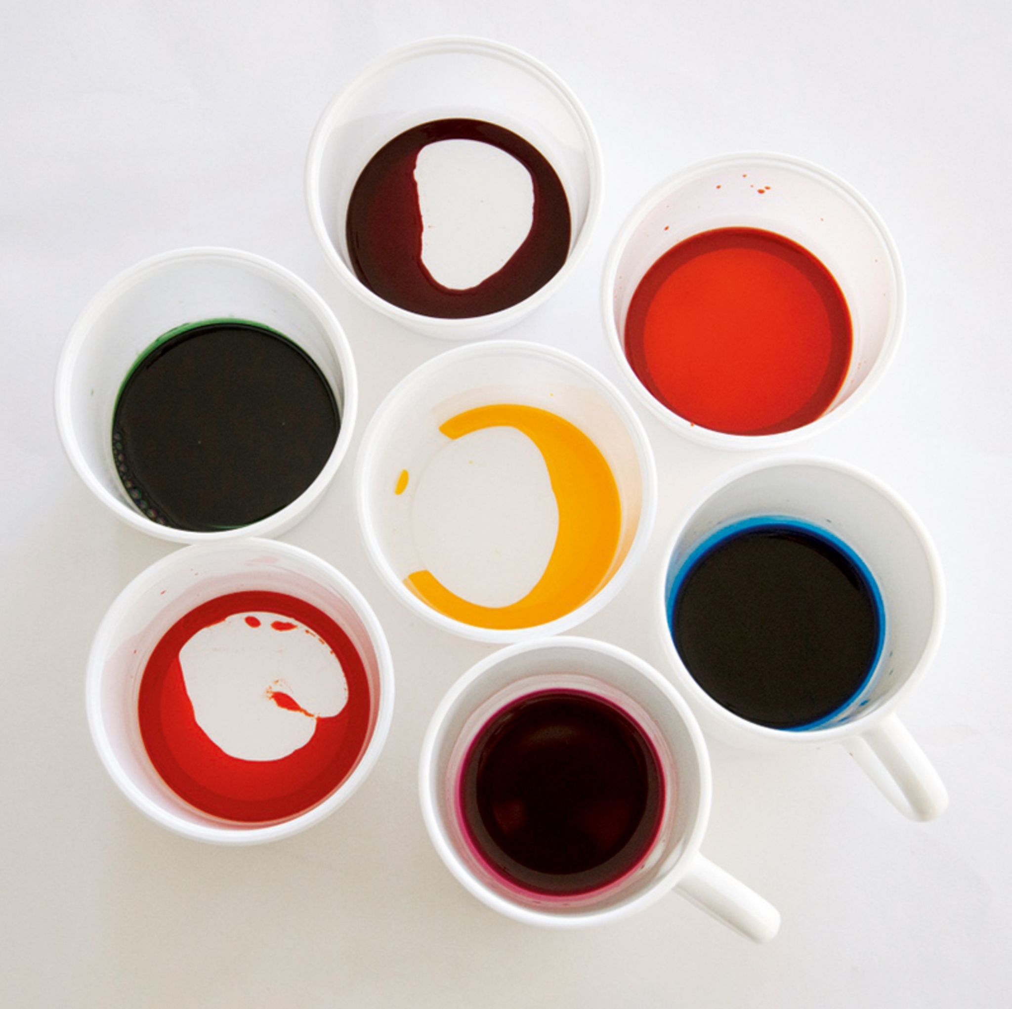 1: Fülle die Farbe zum Eier färben in mehrere Behälter, etwa in Tassen oder Becher.