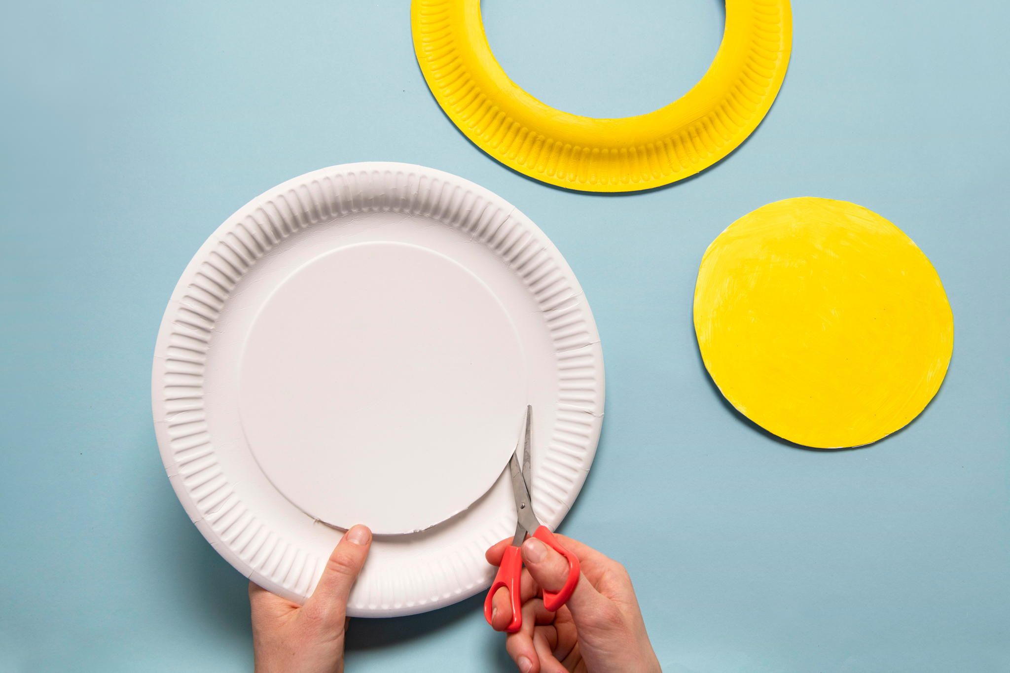 1: Bemale die Rückseiten von zwei Papptellern mit gelber Farbe. Wenn die Farbe getrocknet ist, schneide mit einer Schere die Tellerböden heraus.