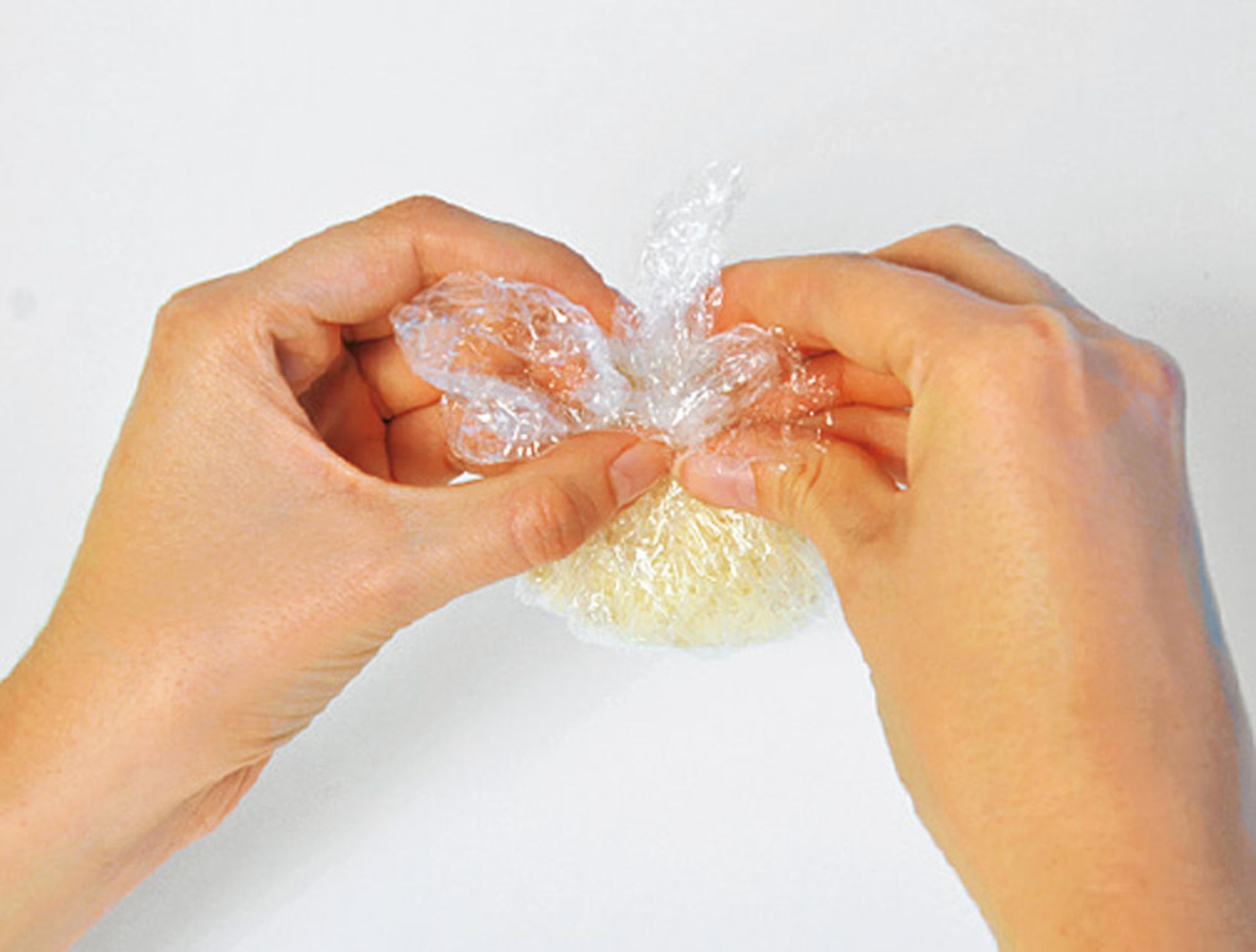 Wickelt etwas Reis in die Frischhaltefolie und formt eine Kugel