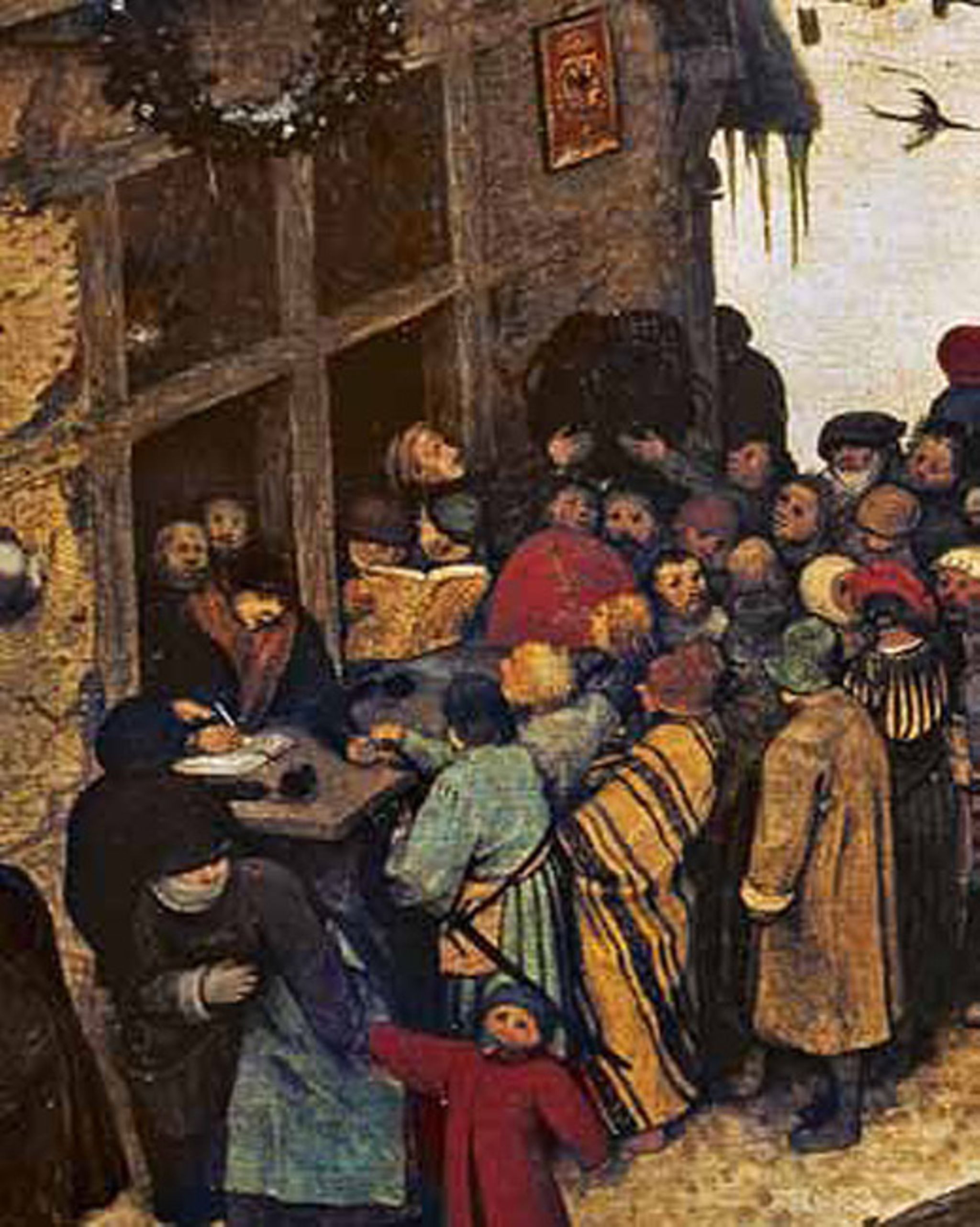 1566 malt Pieter Bruegel die "Volkszählung zu Bethlehem". Gut 200 Menschen sind auf dem Gemälde zu erkennen, und der Maler lässt es aus der Entfernung aussehen wie ein großes Spiel. Erst beim Nähertreten erkennt man die Trostlosigkeit und die Last, die kaputten Wagen im Schnee und die von der Arbeit gebeugten Rücken.