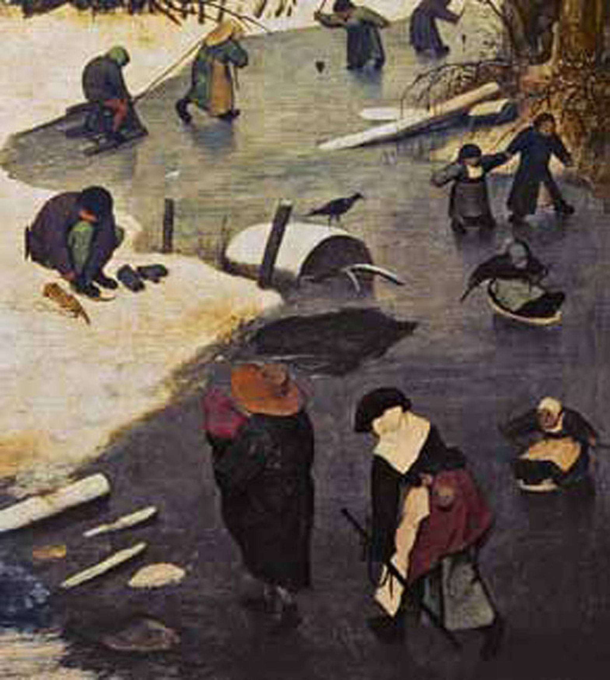 Unter dem bleigrauen Himmel dieser beginnenden Kälteperiode erfindet Bruegel ein neues Genre: das Winterbild. Er fängt das Licht eines Dezemberabends ein, wenn der Schnee die letzte Sonne reflektiert und einsetzende Finsternis einen blauen Schimmer über die Landschaft wirft. Es wird langsam dunkel und kalt, das Zwielicht schluckt die Schatten. Bald ist die Welt eine andere, wird eng und stumpf. Bruegel malt als Erster den Fall des Schnees, bildet den Wechsel der Jahreszeiten so detailliert ab wie keiner vor ihm.