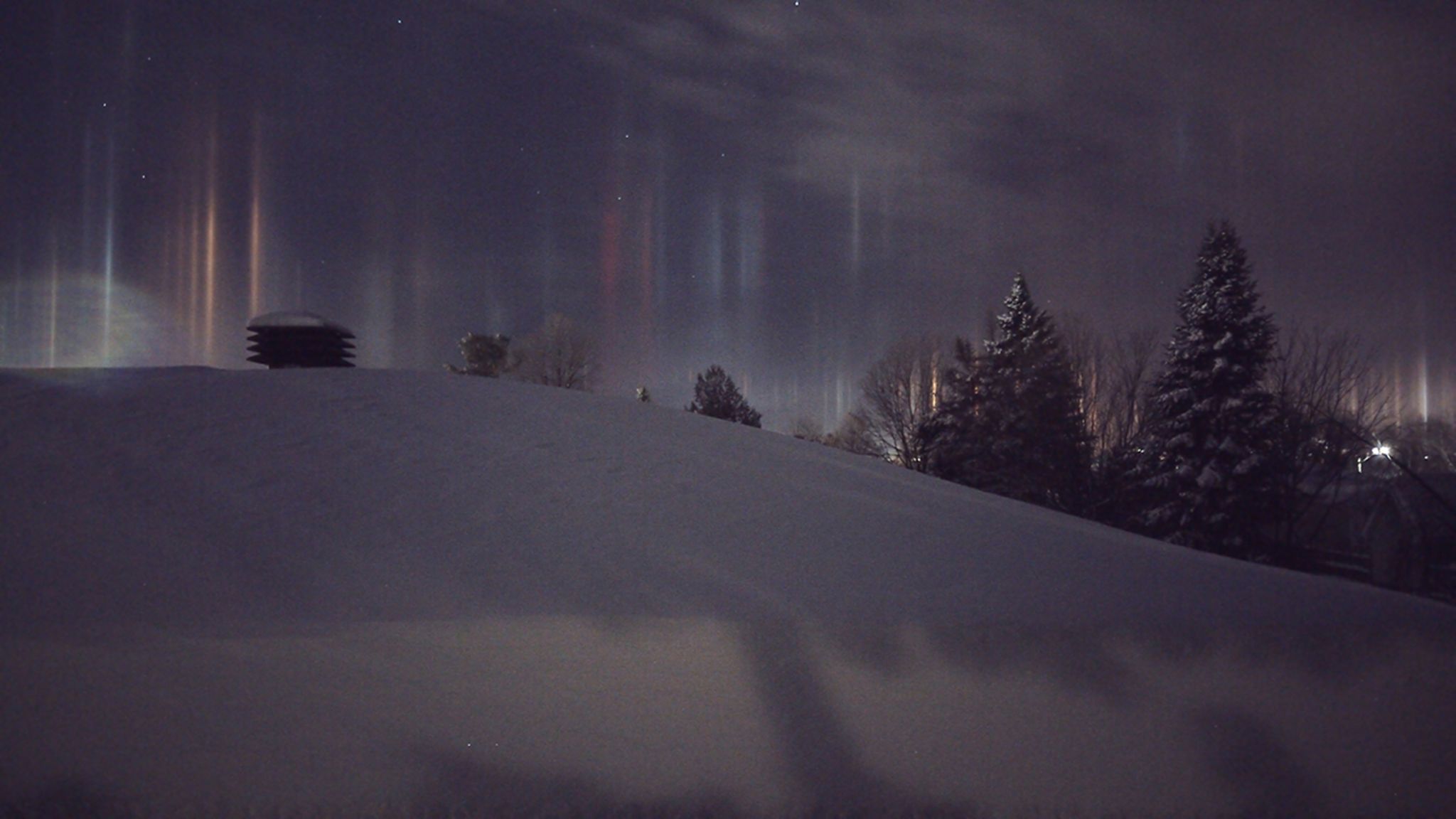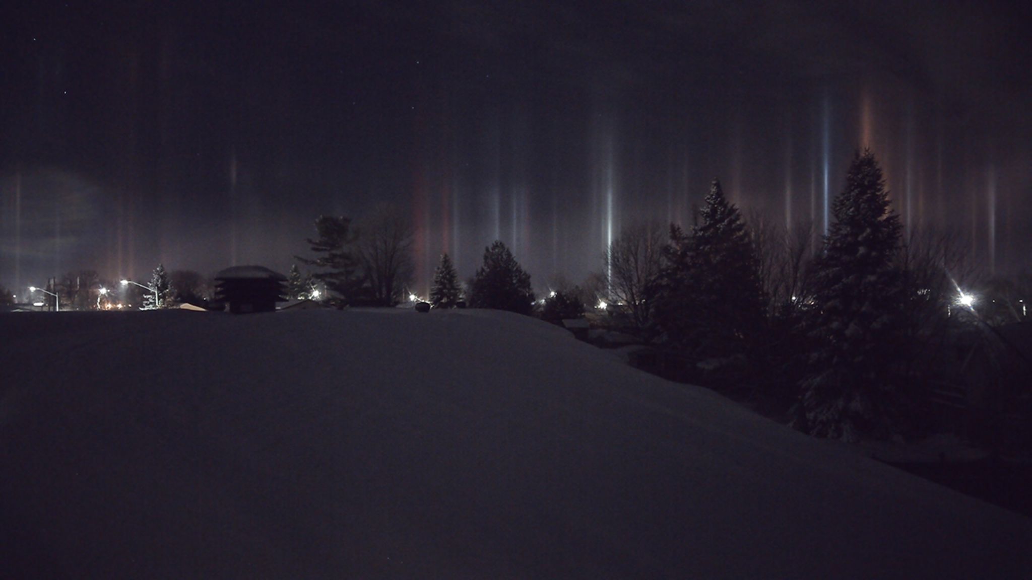 Timmy Joe Elzinga wird um 01:30 Uhr nachts durch sein zweijähriges Kind aufgeweckt. Doch was ihn dann wachhält, ist etwas ganz anderes: "Ich bin beinahe ausgeflippt", erzählt der Kanadier. "Da waren Lichtbalken, die den Nachthimmel erleuchteten. Meine Frau kam und schaute sich das Geschehen mit mir an. Aber ich wollte es genauer wissen. Also öffnete ich das Fenster, um ein paar Fotos zu schießen. Es war unfassbar kalt draußen. Zunächst dachte ich, es handle sich um Nordlichter. Doch diese Lichtstreifen schienen viel näher zu sein und aus dem Boden zu schießen." Ein paar Suchmaschinenanfragen später war Elzinga schlauer. Was er da beobachtete waren sogenannte Lichtsäulen.