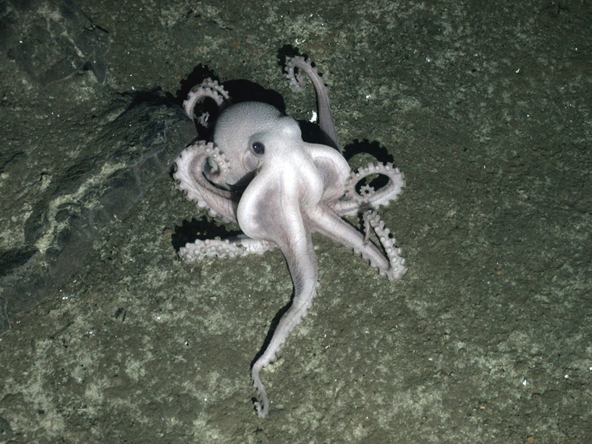 Das Weibchen des Tiefsee-Oktopus Graneledone boreopacifica bewacht seine Eier viereinhalb Jahre lang in einer Meerestiefe von über 1000 Metern. Nach dieser Brutzeit sind die Jung-Kraken dann schon sehr weit entwickelt.