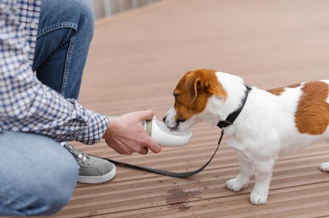 Die Erstausstattung für Hunde besteht bei Spaziergängen und längeren Ausflügen bestenfalls aus biologisch abbaubaren Kotbeuteln, einer Leckerli-Tasche und einer Hundetrinkflasche. Denn wenn ihr Vierbeiner sich austobt, sollte er, ebenso wie der Mensch, ausreichend trinken. Als Faustregel gilt: 20 bis 100 Milliliter pro Kilogramm Körpergewicht.