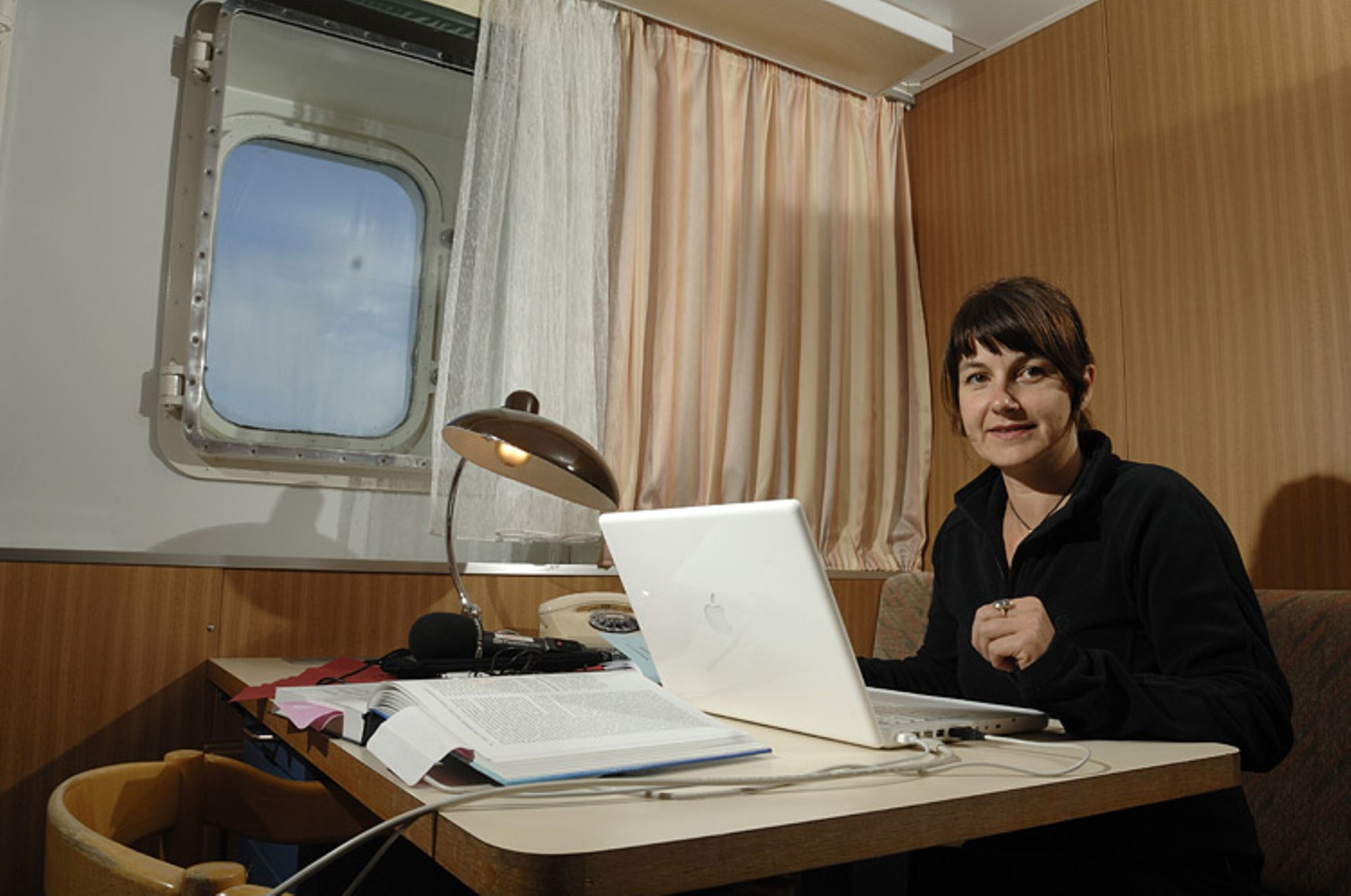 Zuerst nehme ich meine Kabine genauer unter die Lupe. Sie ist ab sofort mein Zuhause, Arbeitsplatz und Rückzugsort: eine gemütliche Koje, in der Mitte Tisch und Stuhl, Schrank, Regale - alles niet- und nagelfest verzurrt, und zu meiner großen Freude zwei große Bullaugen mit Blick aufs Meer. Dann begebe ich mich auf Entdeckungsreise durchs Schiff, begegne auf den engen Fluren anderen Neuankömmlingen mit fragenden Gesichtern: Wo sind die Labore? Wo werde ich arbeiten? Wo sind all die Container, in denen noch das Equipment lagert, Kinosaal, die Sauna, das Schwimmbad, der Fitnessraum und nicht zuletzt: Wo ist die Messe, der Speisesaal?