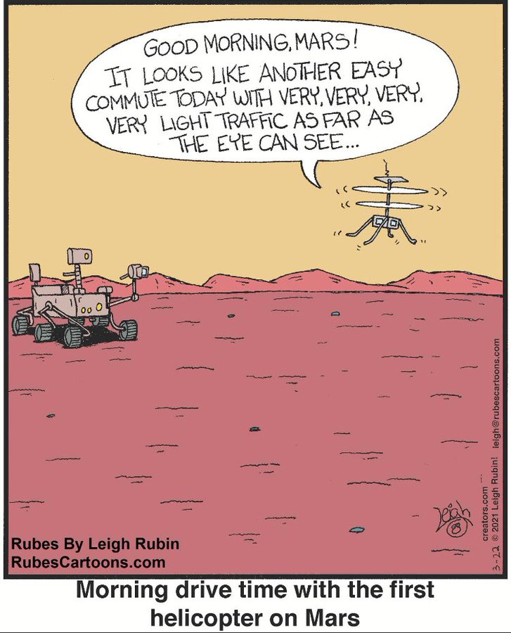 An Ingenuitys Seite bleibt die ganze Zeit der Rover Perseverance, denn nur er hat die nötige Funkverbindung, um Ingenuitys Flugdaten und -aufnahmen zur Erde zu funken. Gemeinsam erkunden sie in den kommenden drei Jahren den Mars – und schießen wie hier auch mal ein Selfie. Das so verschiedenartige wie unzertrennliche Duo erreicht Kultstatus unter Raumfahrtfans und inspiriert zu zahlreichen Memes und Comics.