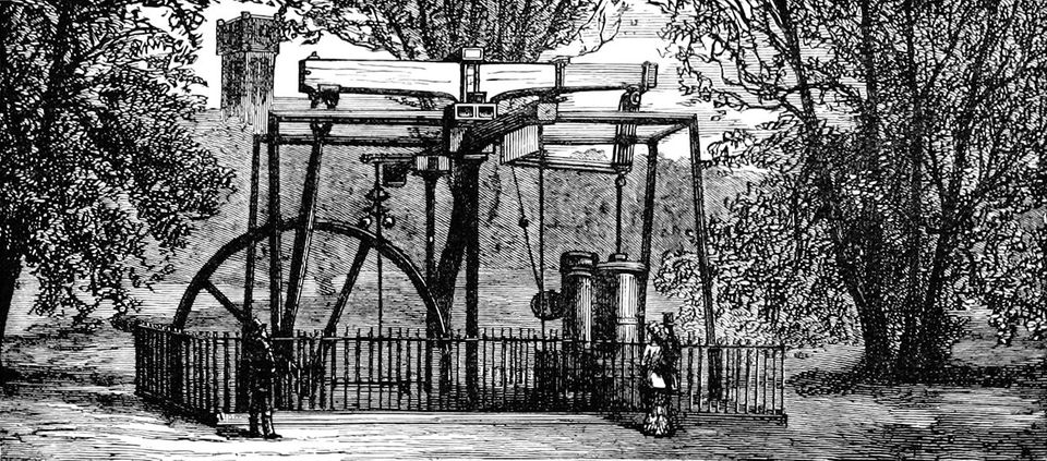 Da der Kolben über einen Hebelbalken, eine Art Wippe, mit einem Pumpgestänge verbunden ist, saugt seine Bewegung das Wasser nach und nach aus den Schächten. Von Pferden angetriebene Pumpen reichen nur halb so tief. Bald entwässern Hunderte von Newcomens Atmosphärenmaschinen britische Gruben.