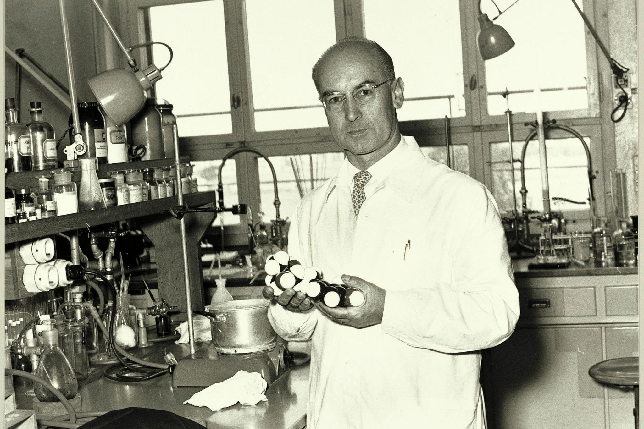 Albert Hofmann, Erfinder des LSD in seinem Labor in einem weissen Kittel in seinem Labor in den 50er Jahren
